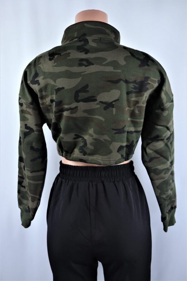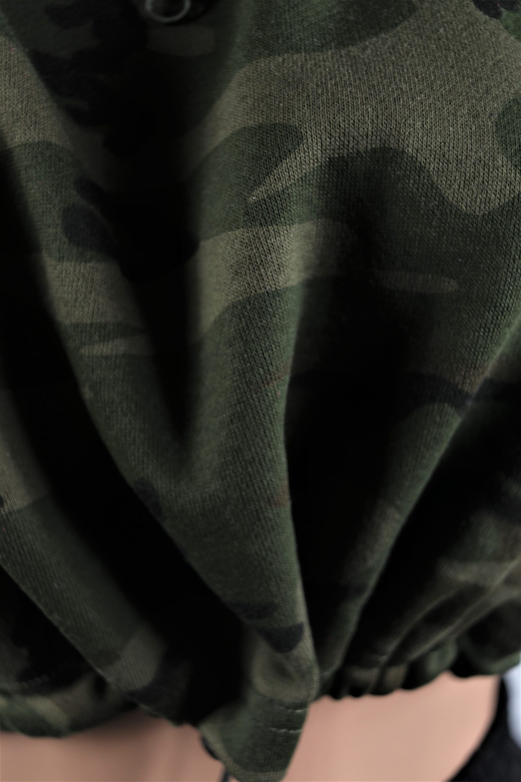 Zipper high neck camouflage long sleeve drawstring crop top.