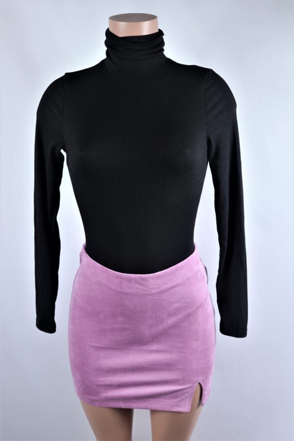 High waisted faux suede mini skirt with slit.