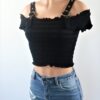 Plain ribbed off the shoulder buckle crop top in black, white, pink, yellow.
