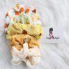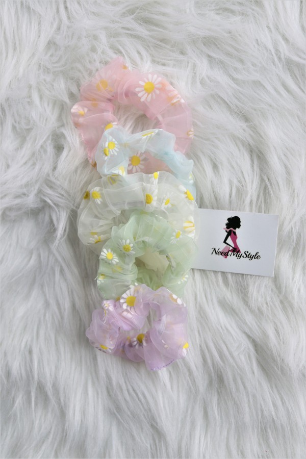 5 pieces set of multi color textured scrunchie. Floral, polka dot, hearts, paisley, fruit, plaid and checkered scrunchies.