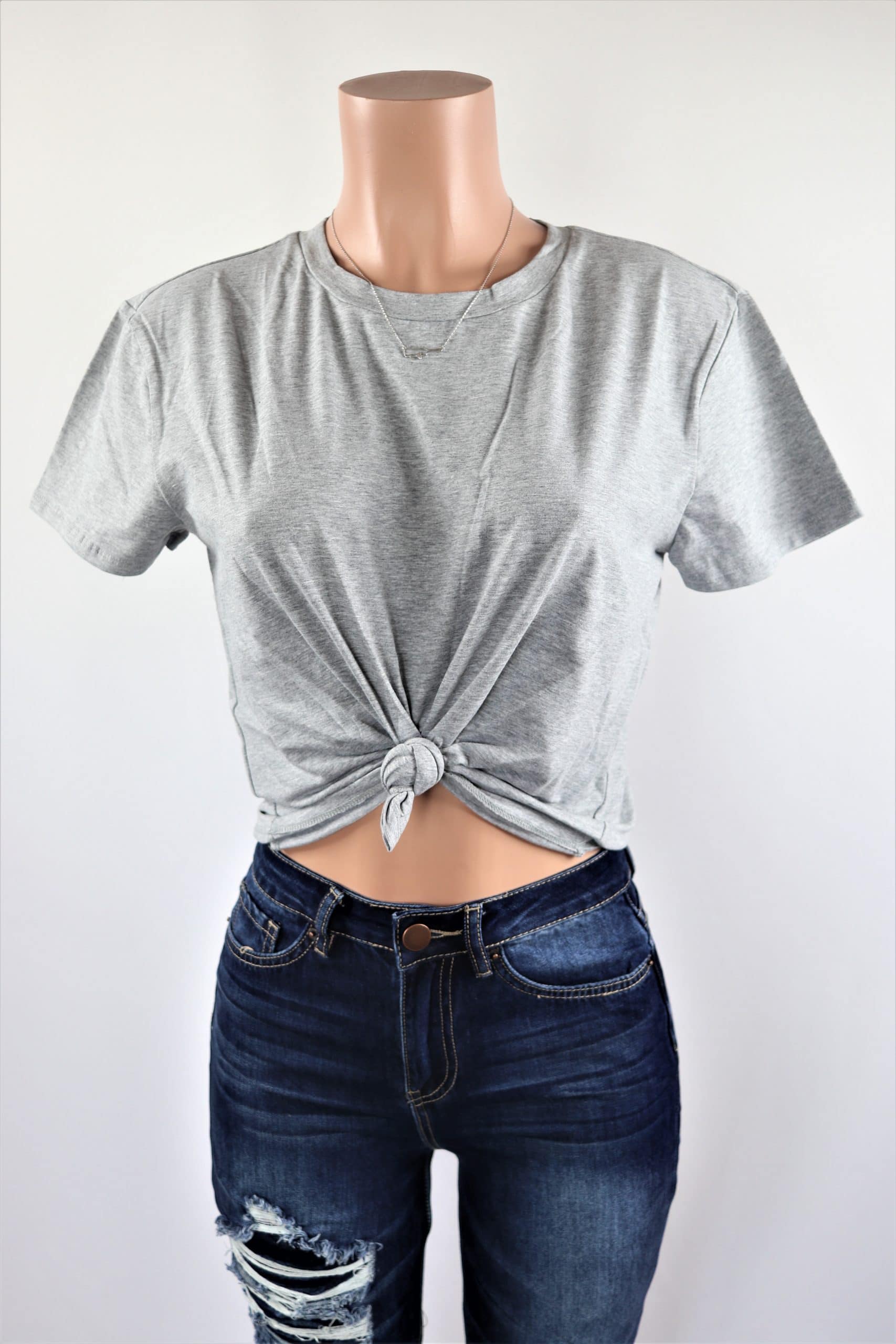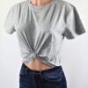 Round neck black gray grey knotted front simple short sleeve crop top.
