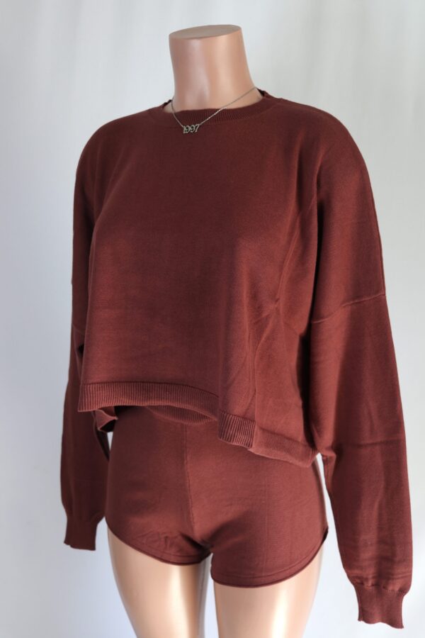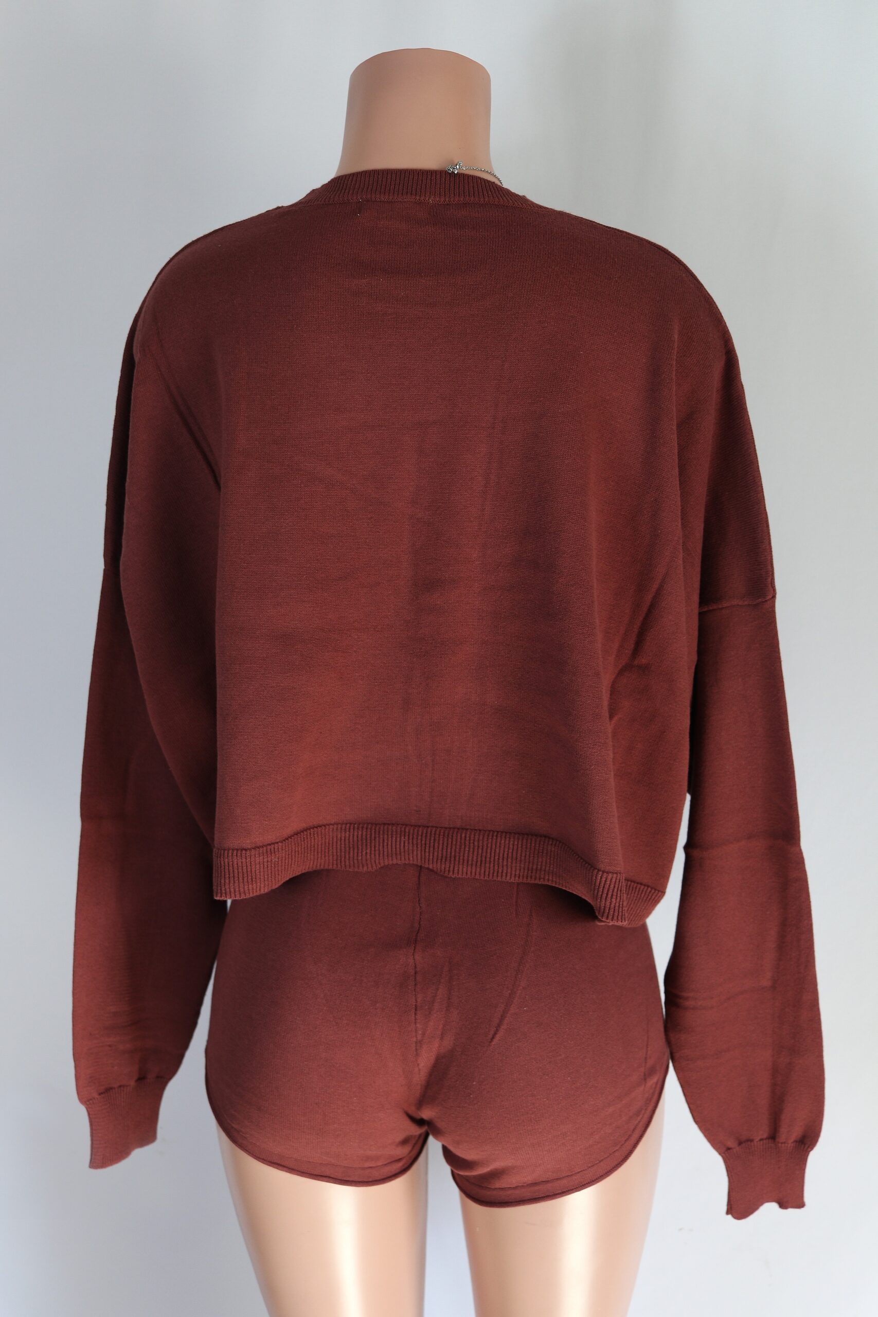 High waisted brown knit shorts and lounge long sleeve crop top set.