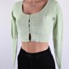 Bisque, Black and Sage soft knit ribbed long sleeve button up crop sweater top.