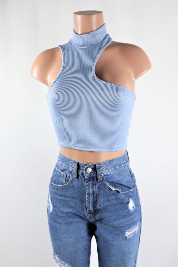 Ribbed Sleeveless blue mock neck cutout crop top.