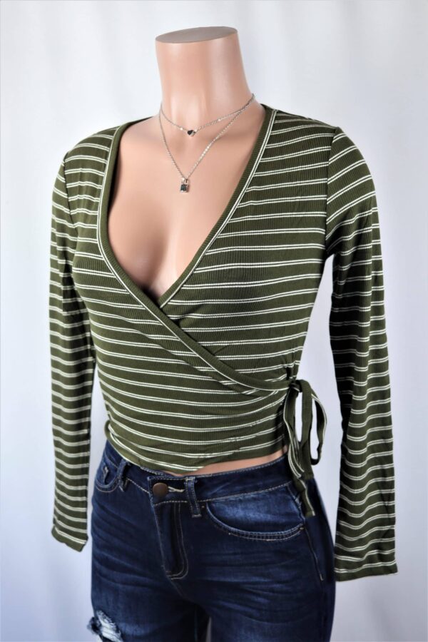 Olive Stripe Wrap Top Long sleeve v neck striped wrap top. 92% Rayon 8% Spandex Cannot be untied. Weight N/A Size L, M, S Reviews There are no reviews yet. Be the first to review “Olive Stripe Wrap Top”Cancel ReplyYour email address will not be published. Required fields are marked *Your rating * Rate… Perfect Good Average Not that bad Very poor Name *Email *Your review * Save my name, email, and website in this browser for the next time I comment. Submit