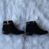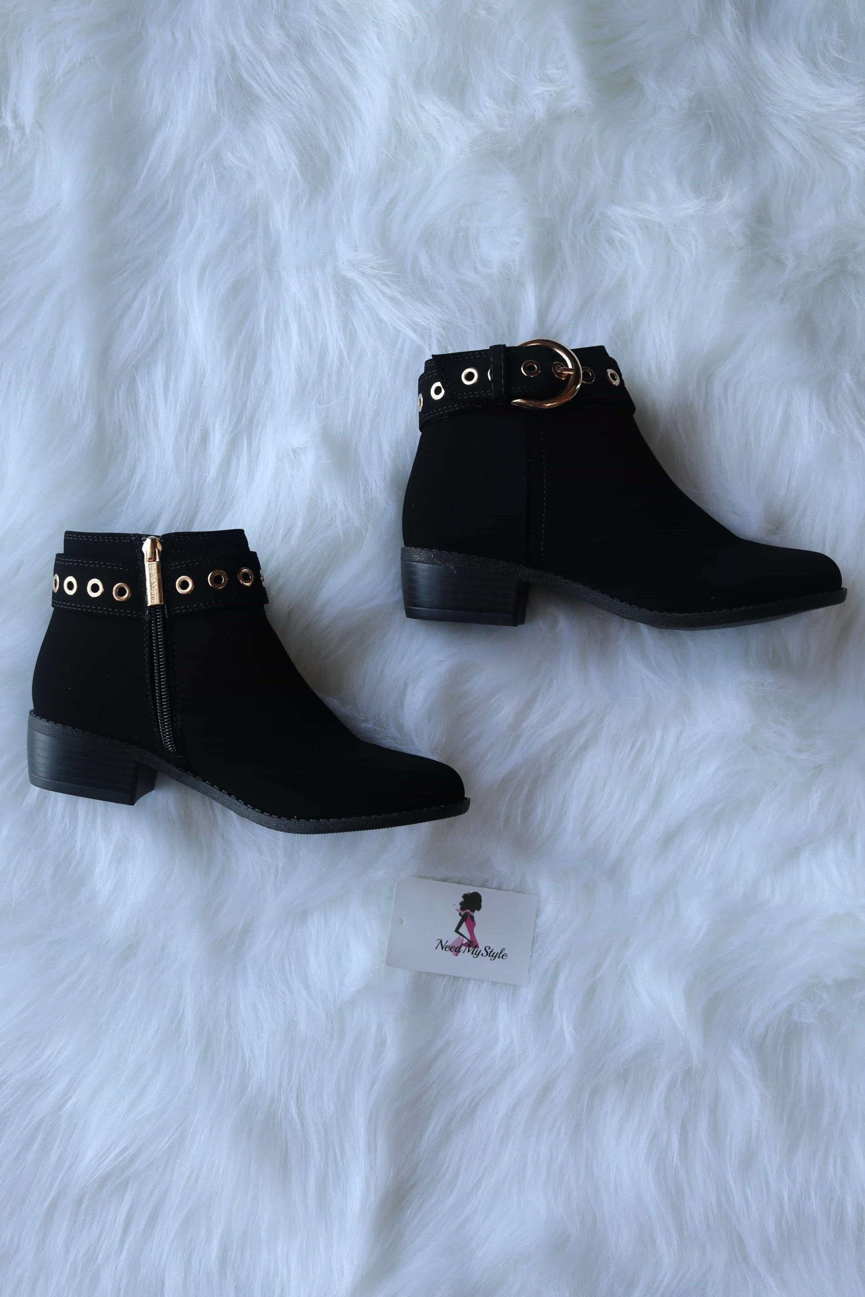 Black Belted bucked pointed toe booties with side zipper.