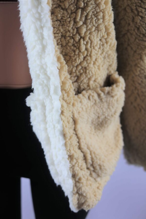 Long sleeve faux fur ivory and taupe super soft teddy jacket with pockets on both sides.
