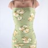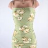 Sage green floral square neck ruched bodycon mini dress.