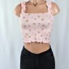 Square neck smocked ruffled shoulder crop top in pink black white.