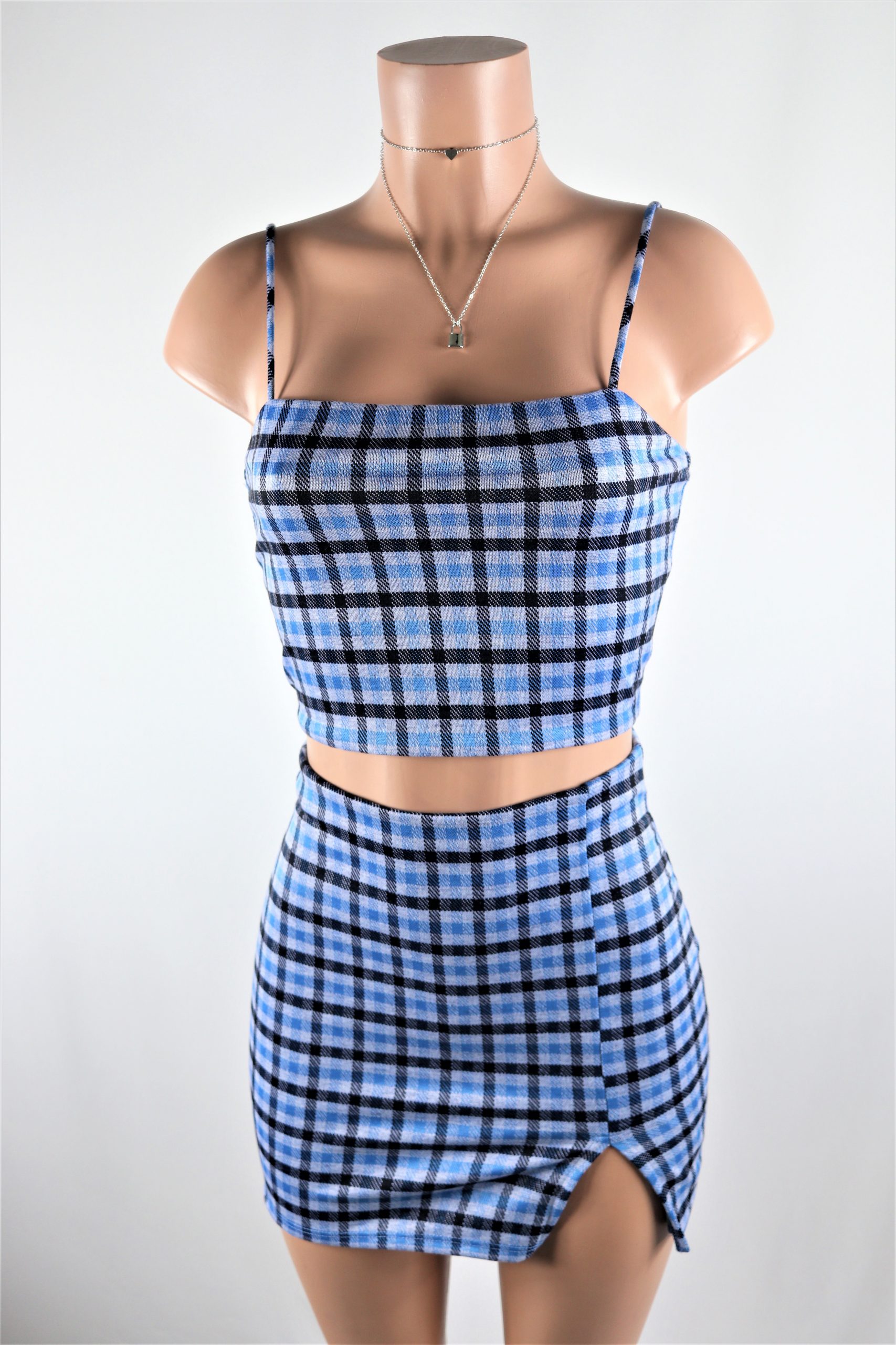 Blue plaid high waisted mini skirt with slit and square neck crop top.