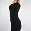 Black and red bodycon off the shoulder mini dress with fake buttons.